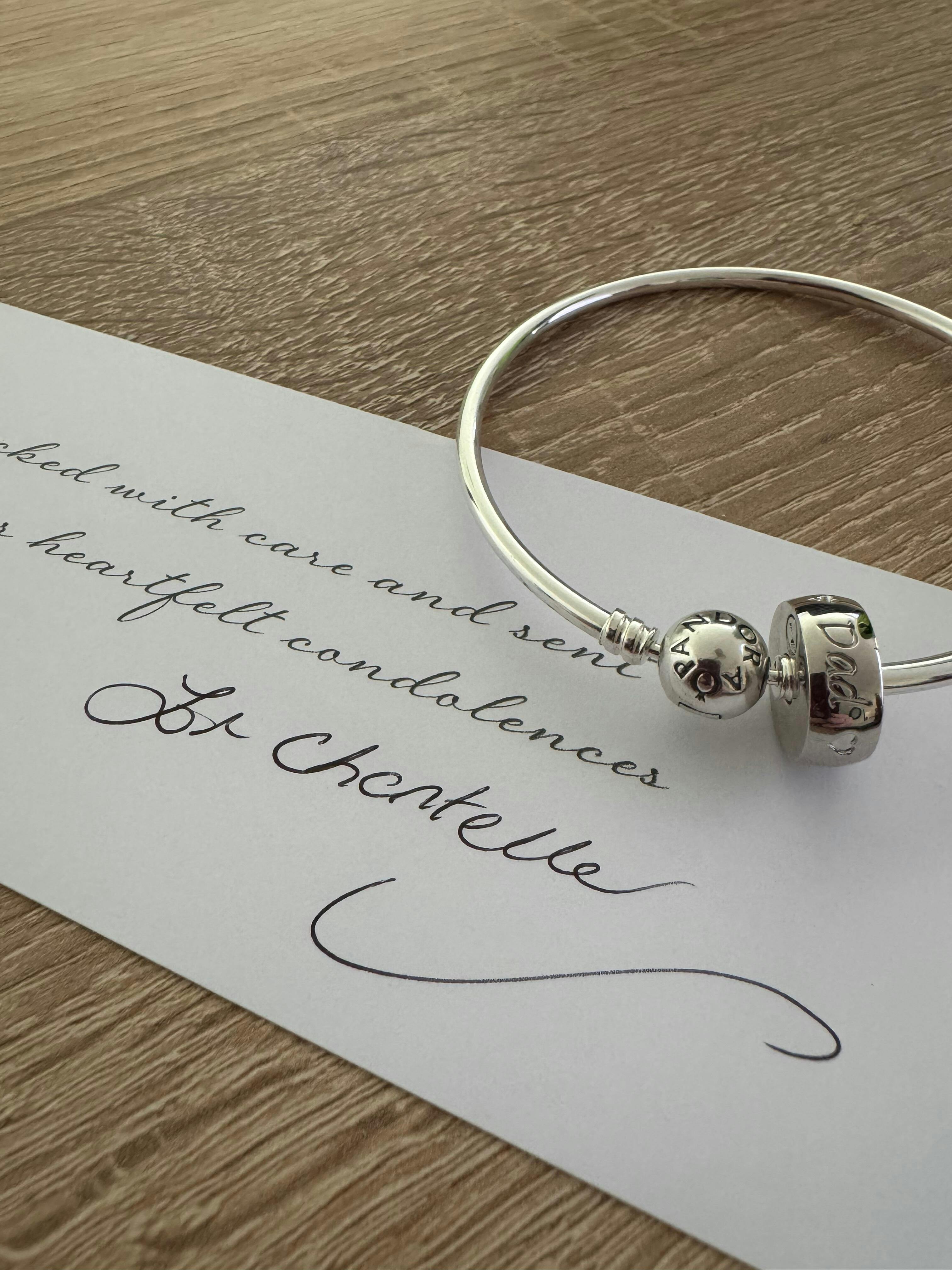 Designed to fit large hole charm bracelets (including Pandora) the charm has been embossed with "Dad" and love hearts around the outside.