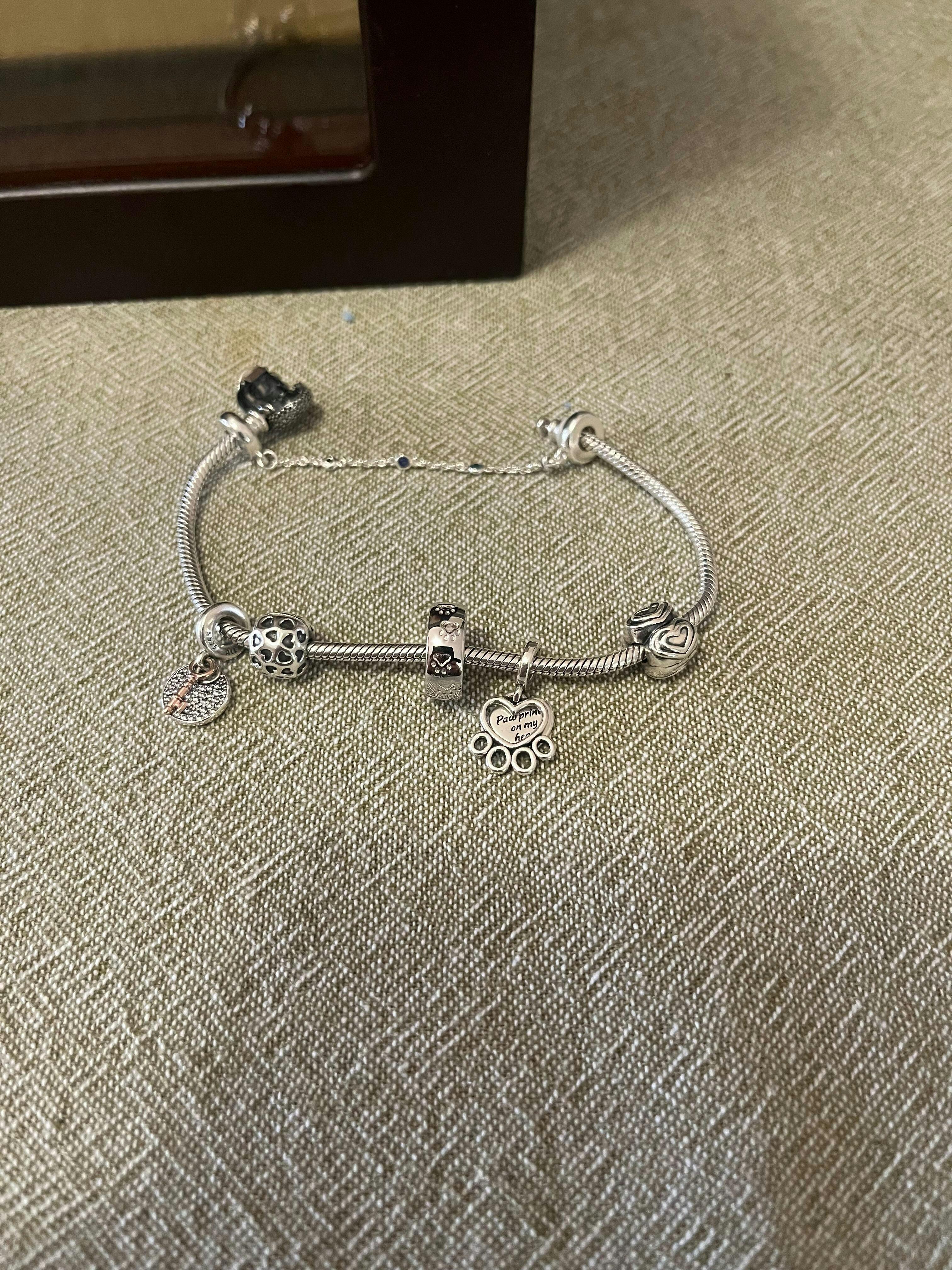 This charm has been embossed with paw prints around the outside. It is solidly constructed in .925 Sterling Silver. It holds cremation ashes safely and securely inside and  has been designed to fit "Pandora" and similar bracelets.
